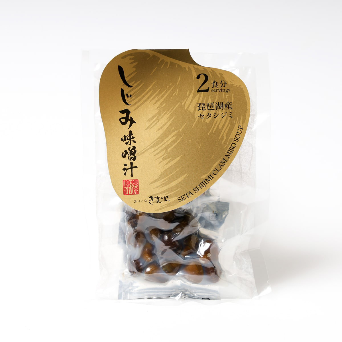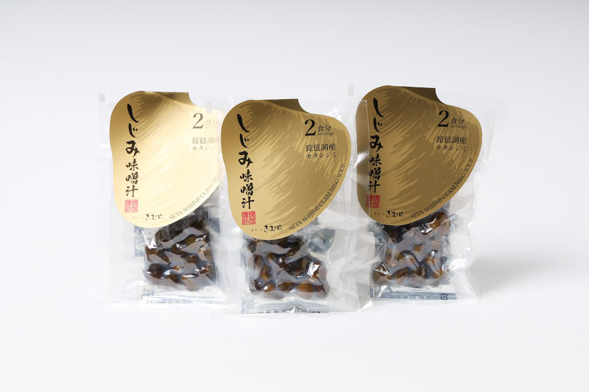 琵琶湖のセタシジミを使ったインスタントの味噌汁です。しじみの殻をデザインとして使いました。高級なしじみなので金色にしています。This instant miso soup is made with Lake Biwa's seta shijimi clam. We used the shells of shijimi clam as a design. The color is gold because of the high quality shijimi clam.