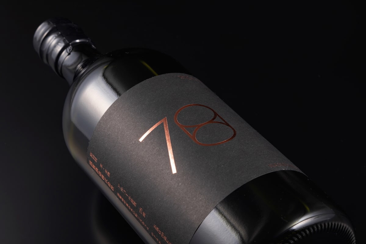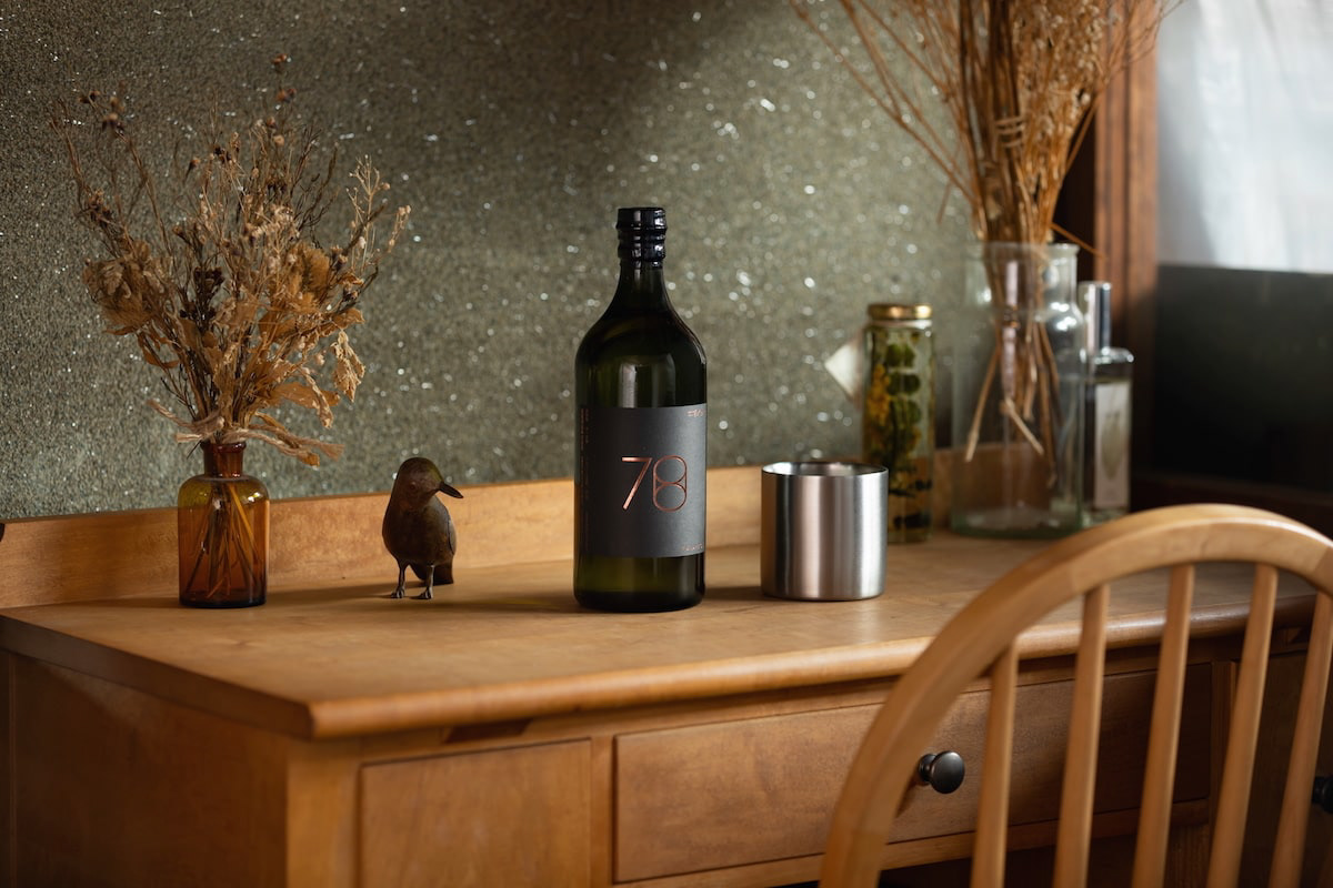 78は米焼酎です。78のステンレスコップにデザインを合わせた焼酎です。78 is a rice shochu; the design of this shochu matches the stainless steel cup of 78.