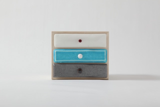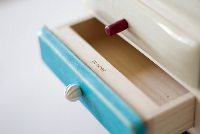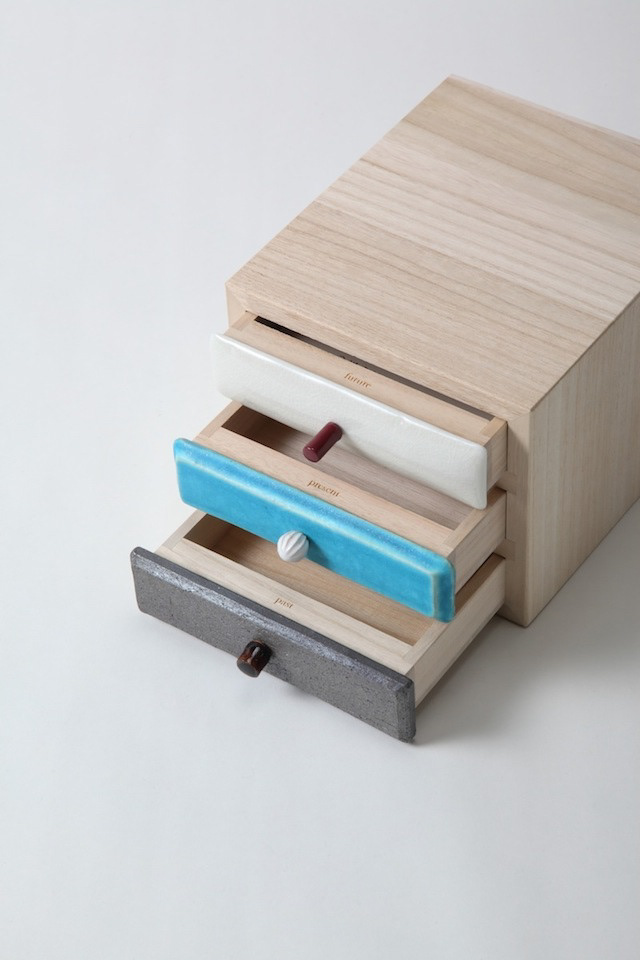 引出しにはそれぞれ、過去の引き出し、現在の引き出し、未来の引き出しと名前が付けられています。 それぞれ過去、現在、未来をイメージした特徴の異なった三枚の陶板で前板が作られています。 陶板は信楽焼で手作りによって作られています。 引き出しを開けるとそこには、past, present, futureの文字が刻まれています。 陶板の引き出しは、何か特別な印象を引き出しにもたらします。 この引き出しをどのように使うかは使用者に委ねられていますが、人にはみなそれぞれの、現在、過去、未来があります。 何か大切なものや情報を入れたりする特別な箱になることを願っています。