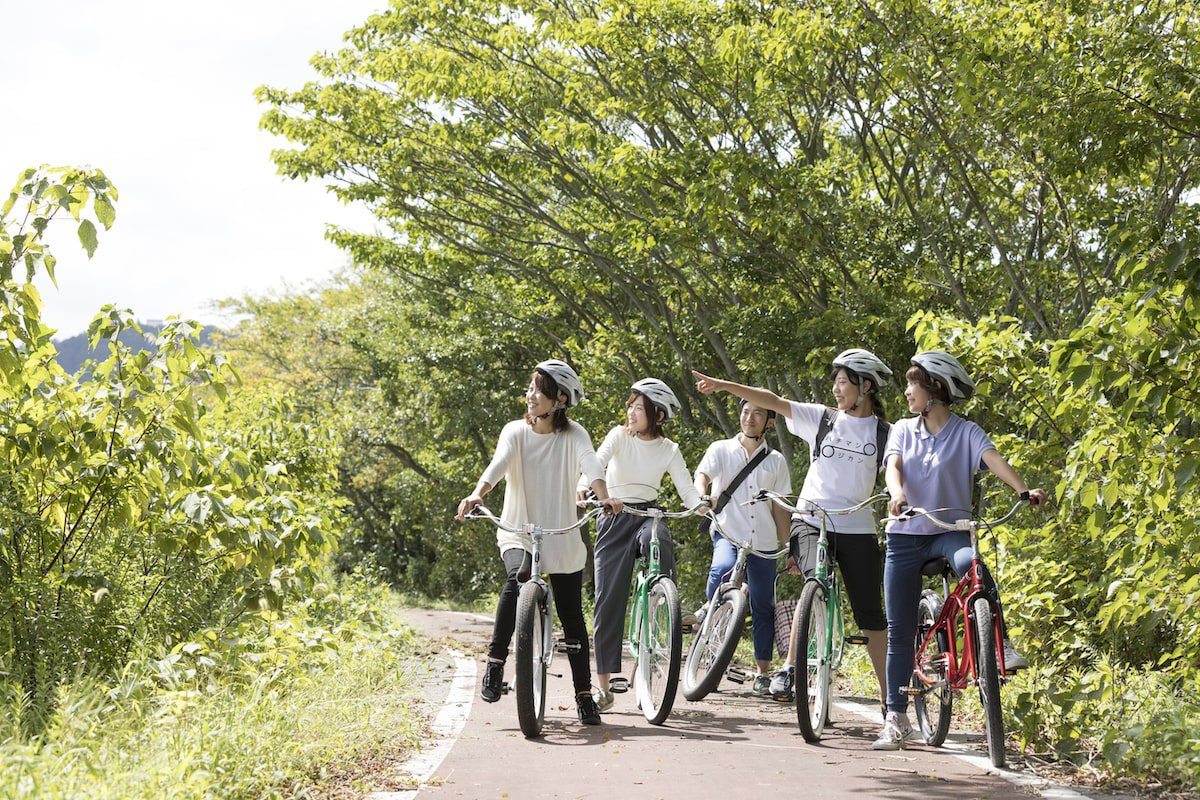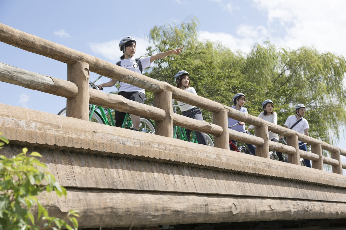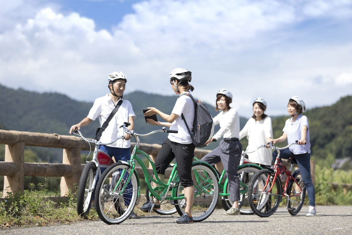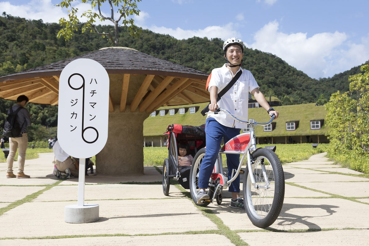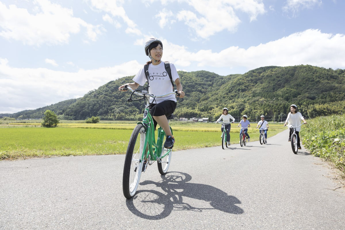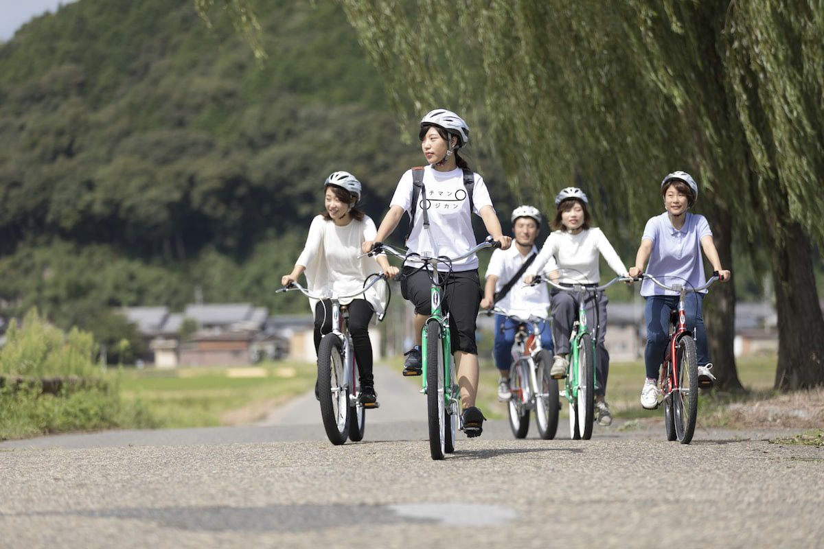 近江八幡の西の湖周辺をビーチクルーザーで自転車ツアーをするツーリズムのブランディング「ハチマンジカン」です。Hachimanjikan" is a branding for a tourism brand that offers bicycle tours by beach cruiser around Lake Nishi in Omi Hachiman.