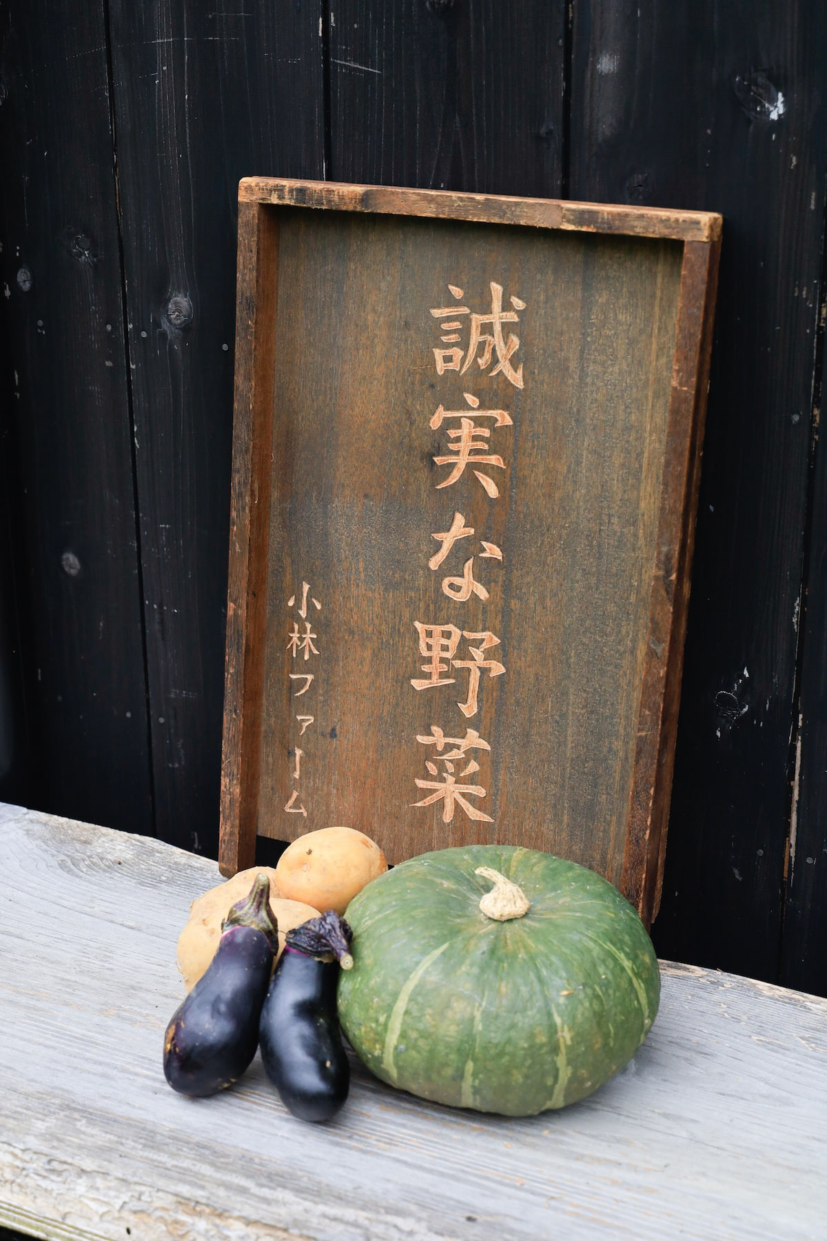 小林ファームのPOP看板を作成しました。誠実な野菜作りをされている農家の良さを素朴な木製看板にしました。We created a POP signboard for Kobayashi Farm. We made a rustic wooden sign to show the goodness of a farmer who grows vegetables with sincerity.