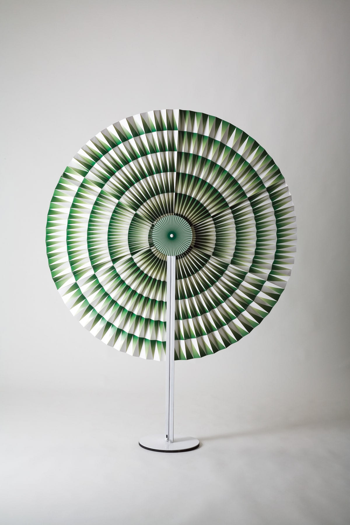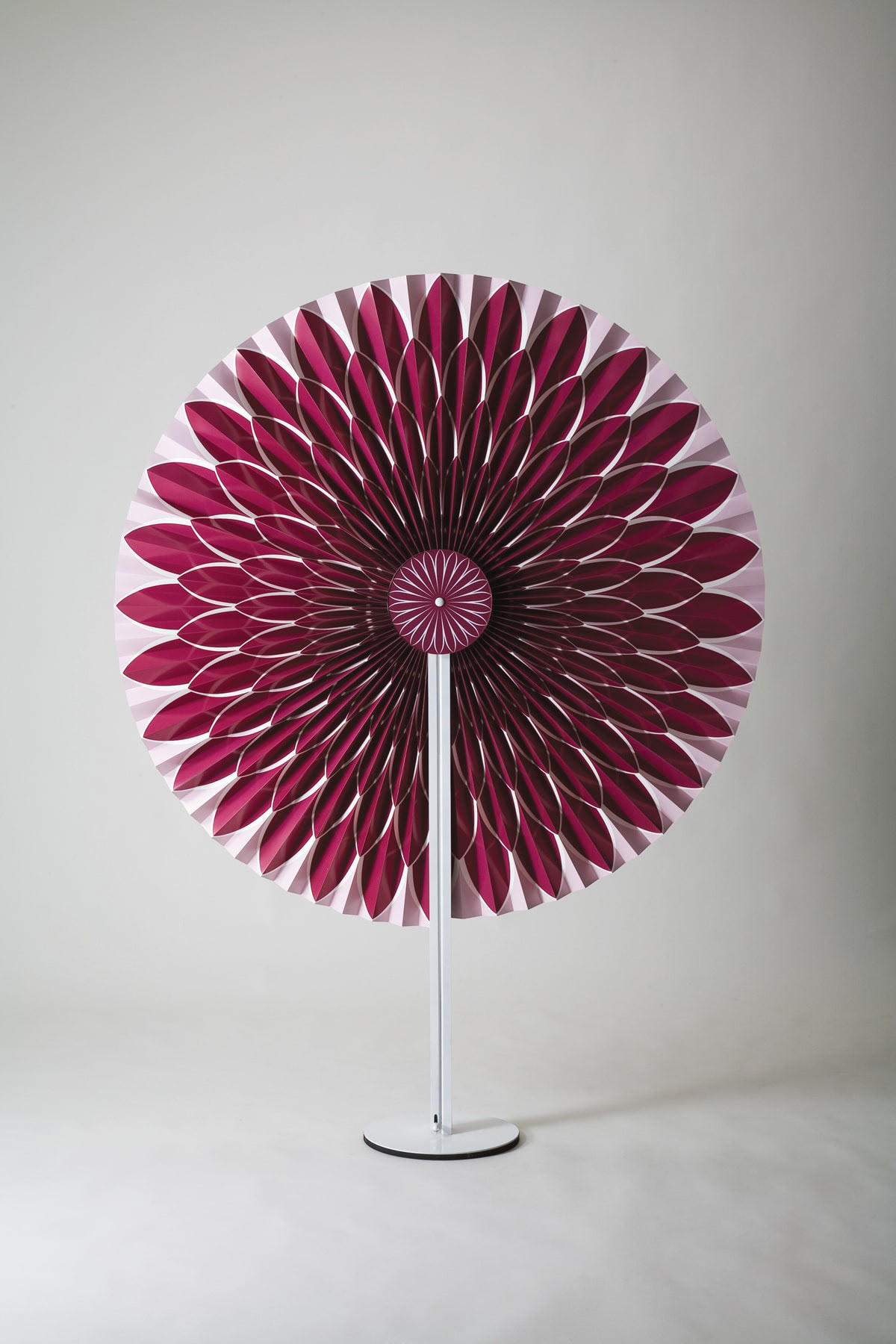KUJYAKUは折りたためるパーティションです。孔雀のように羽を広げて展開することができます。柄は菊と松があります。驚きのあるプロダクトです。KUJYAKU is a foldable partition. It can be unfolded by spreading its wings like a peacock. The patterns are chrysanthemum and pine. It is a surprising product.