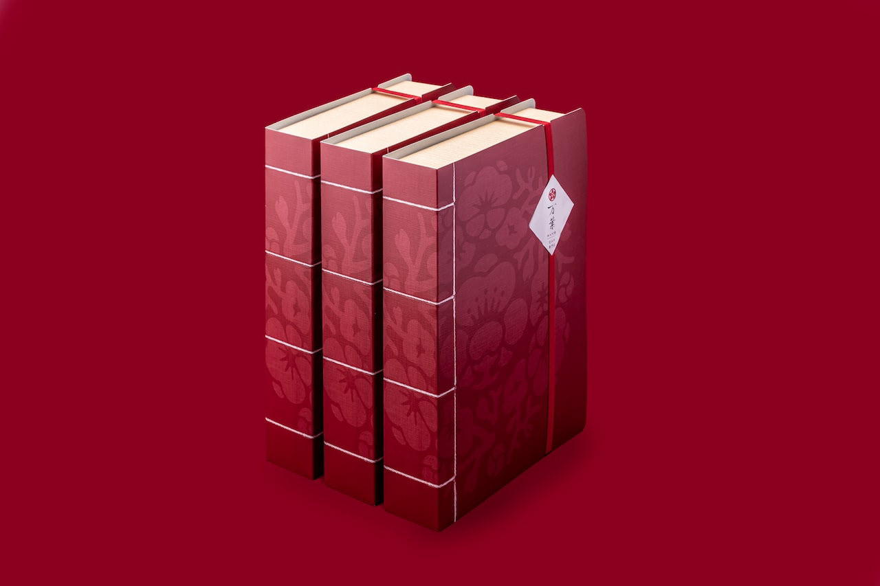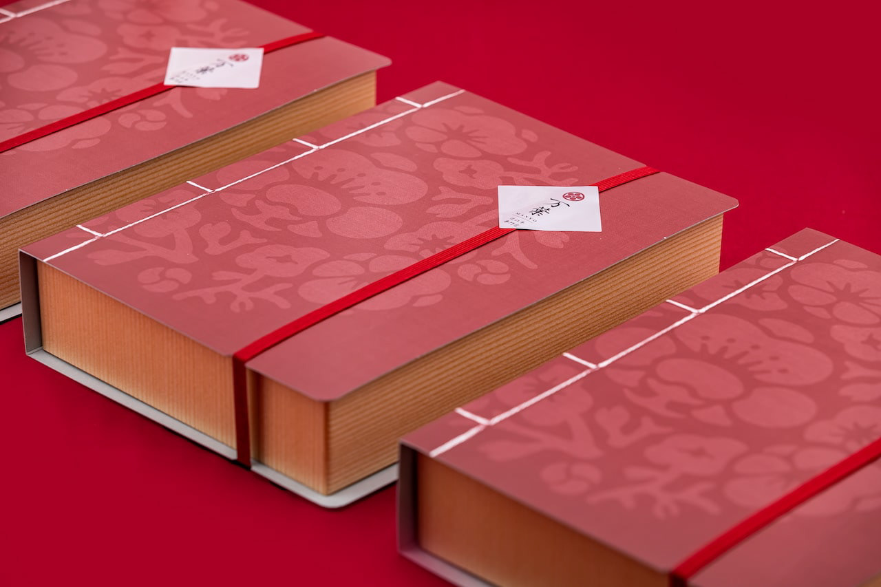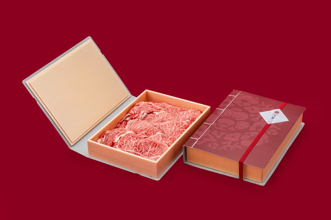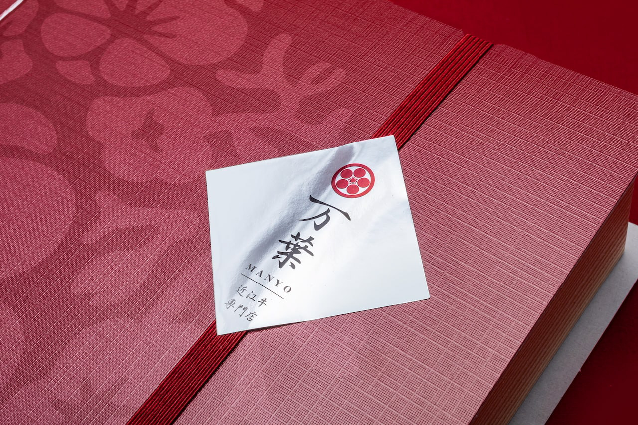近江牛専門店万葉のパッケージデザインを担当しました。 近江牛は日本三大和牛の一つ。日本でも最高の品質の牛肉です。 万葉というお店の名前から万葉集を思いました。 万葉集は、7世紀後半から8世紀後半にかけて編纂された、現存するわが国最古の歌集です。 精肉会社が経営する専門店であり、お肉作りの思いをお客さんに伝えてゆくのに「本」の形が思い浮かび万葉集とつながりました。 和綴と呼ばれる日本の伝統的なの本の綴じ方を模したパッケージに包まれたお肉。本を開ける高揚感と高級感のあるパッケージになっています。 紙にはエンボスの加工で布製本のような表現としました。ゴムとメタルシールでパッケージを封印しています。 最高級のお肉にふさわしいデザインとしました。 We were in charge of package design for the Omi beef specialty restaurant Manyo. Omi beef is one of Japan's three major beef varieties. It is the highest quality beef in Japan. The name of the restaurant, Manyo, made me think of the Manyoshu (The Anthology of Myriad Leaves). The Manyoshu is the oldest existing collection of poetry in Japan, compiled from the late 7th to the late 8th century. As a specialty store run by a meat company, the shape of a "book" came to mind for conveying the concept of meat production to customers, which led me to Manyoshu. The meat is wrapped in a package that resembles the traditional Japanese book binding method called Watoji.The package has an exuberant and luxurious feel of opening a book. The paper is embossed to give it the appearance of a cloth-bound book. The package is sealed with rubber and metal seals. The design was appropriate for top quality meat. The package is designed to be opened with a sense of exhilaration and luxury.
