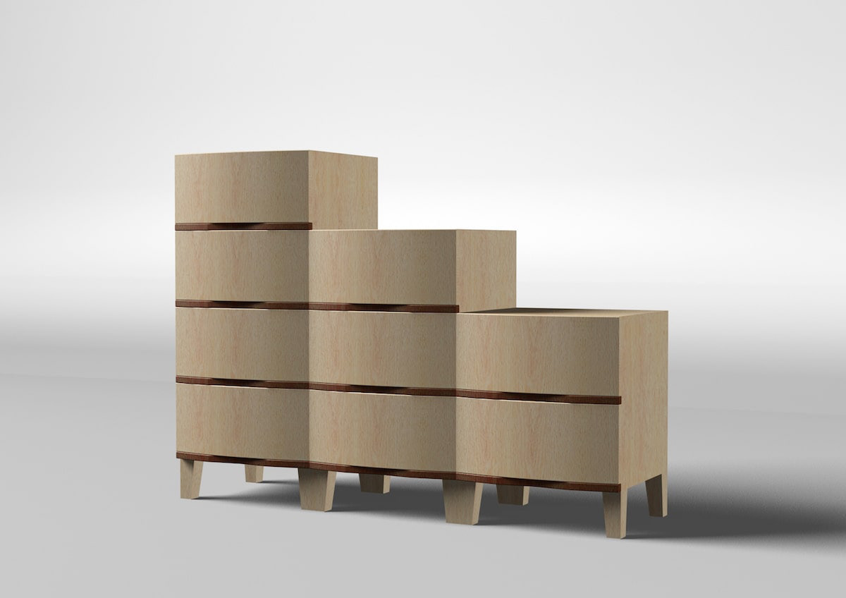 ONDAはイタリア語で波を意味します。これはチェストですが表面が波のようにカーブしています。ウォルナットとヨーロッパビーチに2種類の木のコントラストがあるデザインです。ONDA means wave in Italian. This is a chest, but its surface is curved like a wave. The design has a contrast between two types of wood in walnut and European beach.