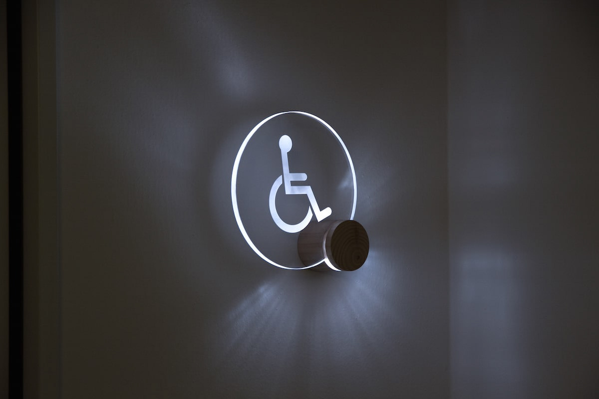 LEDを内臓したアクリルのトイレサインです。サインのベースは木製でLEDが内臓されています。アクリル部分に切削加工が施されてあり、光を拡散し発光します。Acrylic restroom sign with built-in LEDs. The base of the sign is made of wood and contains LEDs. The acrylic part is machined to diffuse light and emit light.
