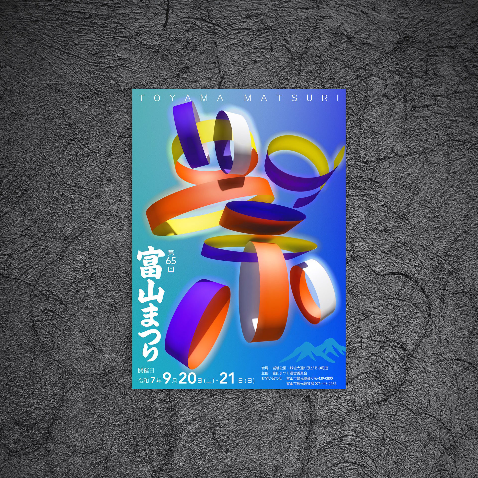 青空の下、元気よく、威勢よく踊り子たちが繰り広げる富山まつり。みんなが一つになって大きな輪を作り、富山まつりを支えているように感じました。このポスターでは、色鮮やかな衣装の色紙を丸めたような輪がたくさんつながって「祭」の文字となって元気よくジャンプして踊っている姿をデザインしました。 Under the blue sky, dancers perform with vigor and spirit at the Toyama Festival. It felt as though everyone came together to form a large circle, supporting the Toyama Festival. For this poster, I designed a scene where numerous circles, resembling rolled-up sheets of colorful costume paper, connect to form the character for “festival” (“祭”), leaping and dancing energetically. 在蓝天之下,舞者们活力四射、气势磅礴地演绎着富山祭典。众人齐心协力编织出巨大的圆环,仿佛正是这般团结支撑着整个祭典。本海报设计中,众多色彩绚丽的服饰色纸被卷成圆环相互连接,构成“祭”字的造型,生动展现了舞者们欢快跳跃、翩然起舞的姿态。